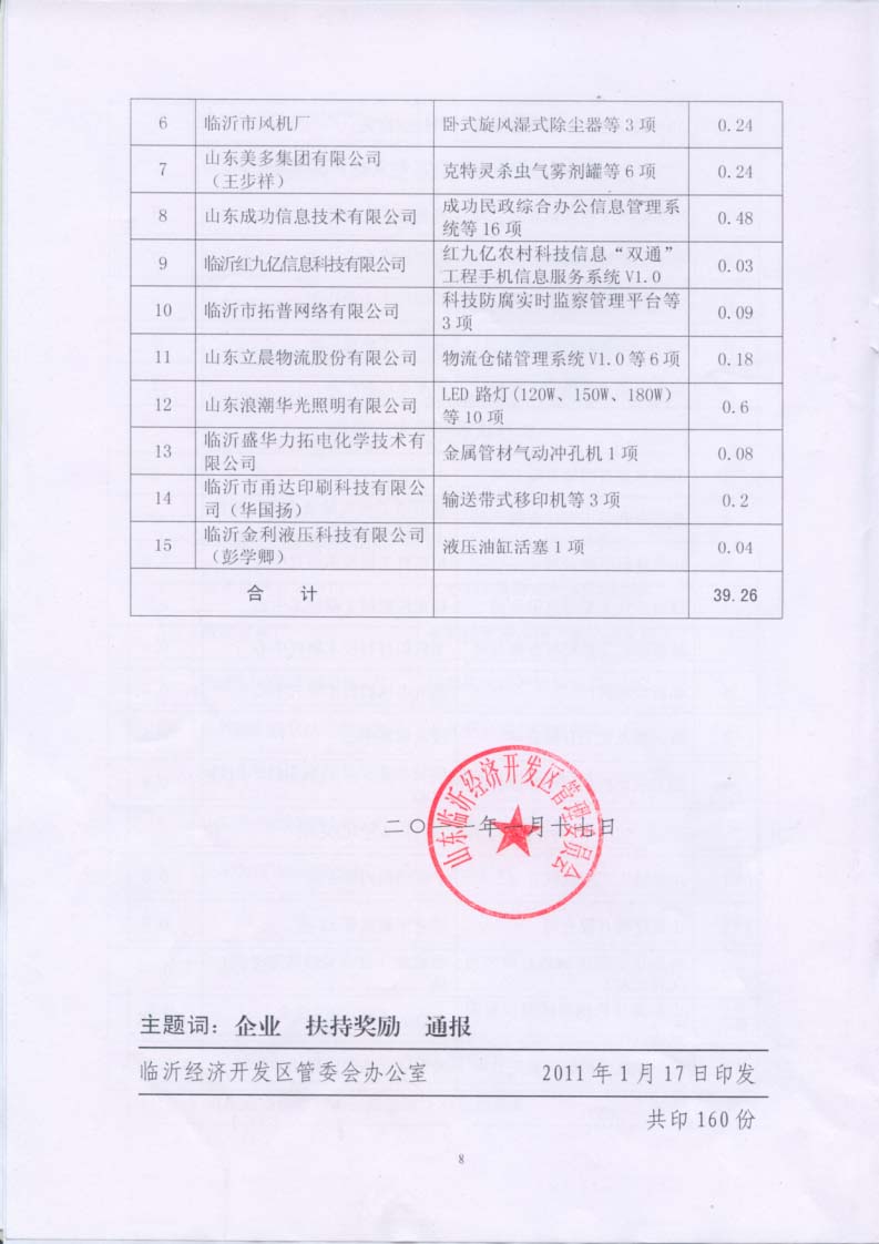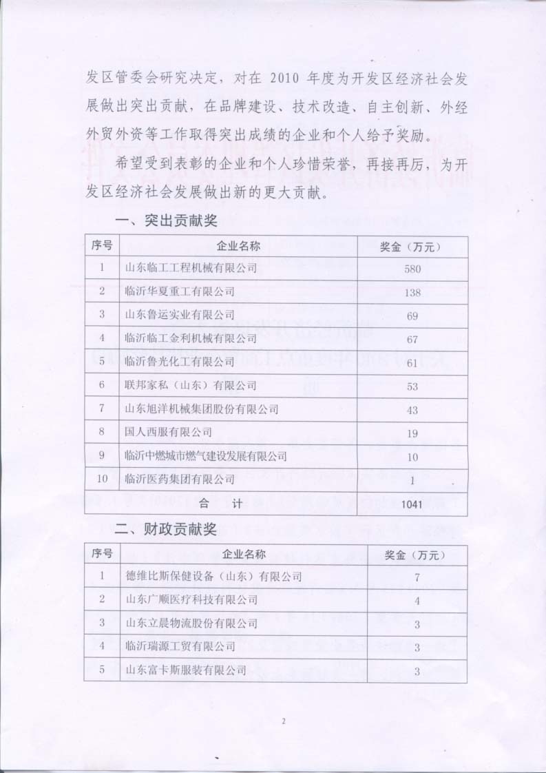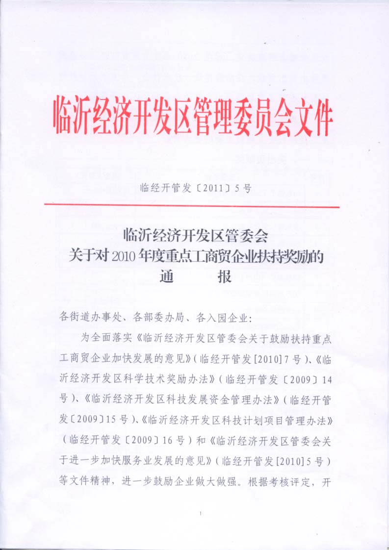 | 熱烈祝賀我公司在臨沂經(jīng)濟技術開發(fā)區(qū)2010年度總結表彰大會上獲多項獎項 |