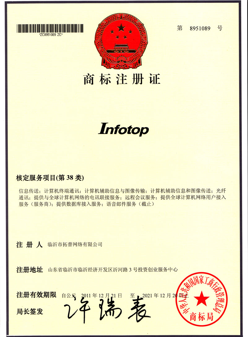2011年12月,國家工商局局長許瑞表簽發(fā)由中華人民共和國國家工商行政管理總局商標(biāo)局頒發(fā)的第8951089號《商標(biāo)注冊證》,我公司已通過商標(biāo)使用注冊認(rèn)證,這標(biāo)志著我公司面向國內(nèi)外市場合法公開使用"Infotop"注冊商標(biāo)。 這次商標(biāo)注冊認(rèn)證,是我公司在信息傳遞;計(jì)算機(jī)終端通訊;計(jì)算機(jī)輔助信息和圖像傳輸;計(jì)算機(jī)輔助信息和圖像傳送;光纖通訊;提供與全球計(jì)算機(jī)網(wǎng)絡(luò)電訊聯(lián)接服務(wù);遠(yuǎn)程會議服務(wù);提供全球計(jì)算機(jī)網(wǎng)絡(luò)用戶接入服務(wù)(服務(wù)商);提供數(shù)據(jù)庫接入服務(wù);語音郵件服務(wù)等先進(jìn)技術(shù)水平和研發(fā)能力的高度認(rèn)可和公司快速健康發(fā)展的充分肯定,是繼我公司被評為"2011年全國電子信息行業(yè)優(yōu)秀企業(yè)"最具潛力企業(yè)、獲得"安防系統(tǒng)智能集成主機(jī)專利"、"音、視頻工程業(yè)企業(yè)特級資質(zhì)認(rèn)證證書"之后的又一喜訊,是公司提供更為優(yōu)質(zhì)的服務(wù),拓展公司市場綜合競爭能力和企業(yè)信用等級,成為準(zhǔn)入國內(nèi)外市場的重要標(biāo)志,是公司跨越發(fā)展中一個(gè)新的里程碑。 公司商標(biāo)注冊的成功,全體員工倍感振奮和自豪,紛紛表示要以這次認(rèn)證為動力,以飽滿的熱情、高昂的斗志,全身心投入到工作中去,以優(yōu)質(zhì)的產(chǎn)品和完美的服務(wù),為公司做大、做強(qiáng)和實(shí)現(xiàn)跨越式發(fā)展作出更大貢獻(xiàn)。