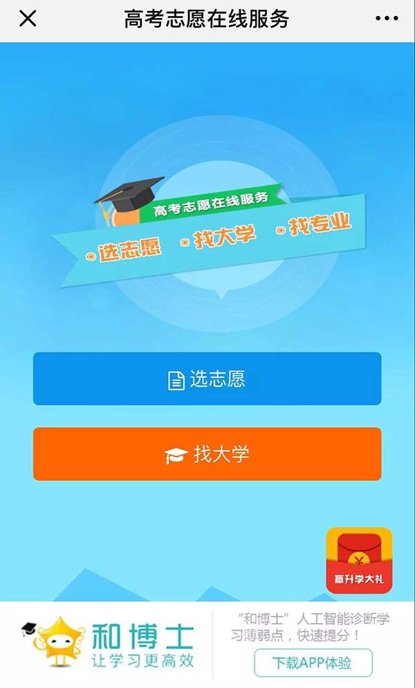 贏取25萬助學金 和博士在教育行業(yè)深耕多年,在幫助學生們提高成績,全面發(fā)展的路上,有著和每個考生同樣的心態(tài)——堅信努力就會有回報。為服務考生,助力高考,和博士特別推出高考季活動,不僅為考生們提供高考志愿免費在線服務,還為廣大考生準備了25萬元的助學金。 通過和博士教育公眾號點擊『高考志愿』-『贏助學金活動』-『我要參加』就有機會領到25萬助學金,快來參加活動吧!