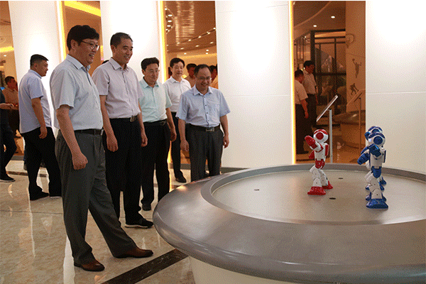 在創客活動中心,趙立新書記一行饒有興致的參觀了綜合實踐區的28間創客工坊,通過實際觀摩3D打印機操作示范、與智能機器人互動等方式感受創客教育的內涵所在,對公司高度重視創客教育建設的做法給予高度認可。在高科技體驗區,趙立新書記一行觀賞了機器魚、跳舞機器人等人工智能機器人產品,并親自體驗VR海底世界、VR自行車、體感游戲等多項先進體驗互動設備,感受尖端科研產品給人們的工作生活帶來的改變。
