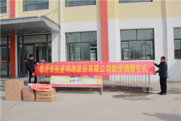 2019年3月21日,臨沂市拓普網絡股份有限公司與民營企業高質量發展服務隊臨沂二隊赴沂南縣銅井鎮金橋聯小舉行“奉獻愛心 捐贈助學”活動,服務隊成員王世臣、李建平以及臨沂市教育局電教館館長徐萬東參加活動。本次活動中,拓普公司為金橋聯小捐贈了足球、籃球、羽毛球拍等數百套體育用品。