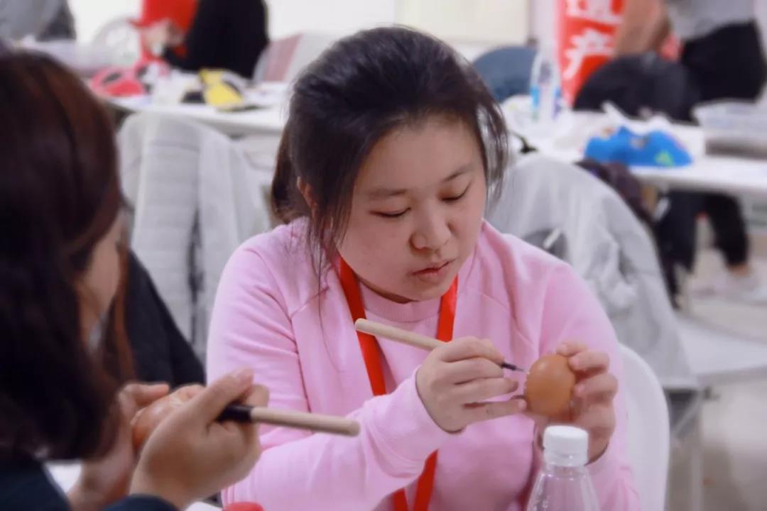 蛋雕是在飛禽類蛋殼上刻琢成畫的一種民間手工藝品,用雕刀在表面顏色較深的蛋殼上雕刻出各種人物、山水、花鳥等圖案。蛋雕的制作難度稍微高一些,來自查爾斯福果中學的學生們小心翼翼的雕刻著自己的作品。