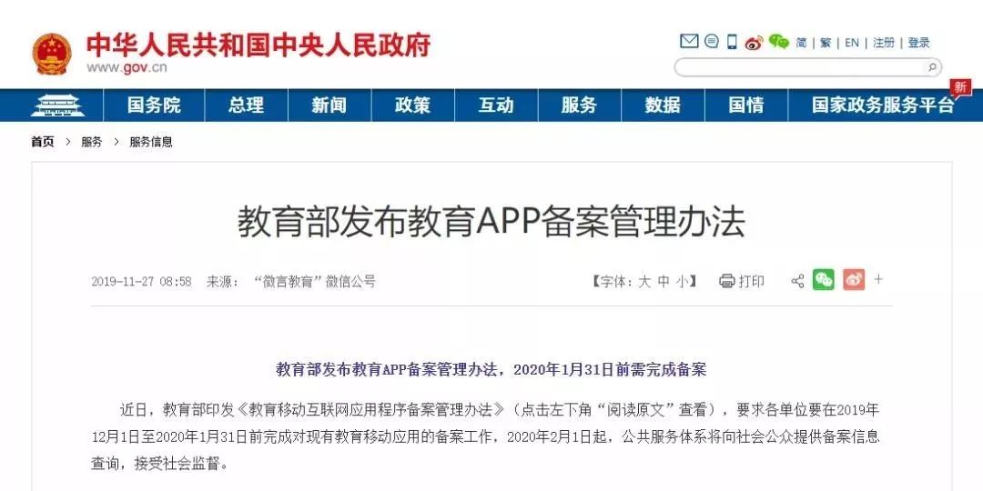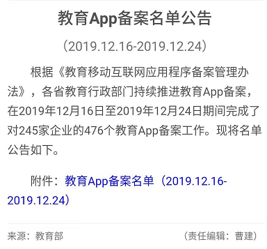 2019年11月,教育部印發《教育移動互聯網應用程序備案管理辦法》,要求2020年1月31日前完成對現有教育移動應用的備案工作。