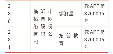 根據《教育移動互聯網應用程序備案管理辦法》,各省教育行政部門持續推進教育App備案。1月2日,國家教育部正式公布了第二批教育App備案名單,476個教育APP完成備案。名單顯示,臨沂市拓普網絡股份有限公司旗下“學測星”和“拓普教育”產品全部過審。